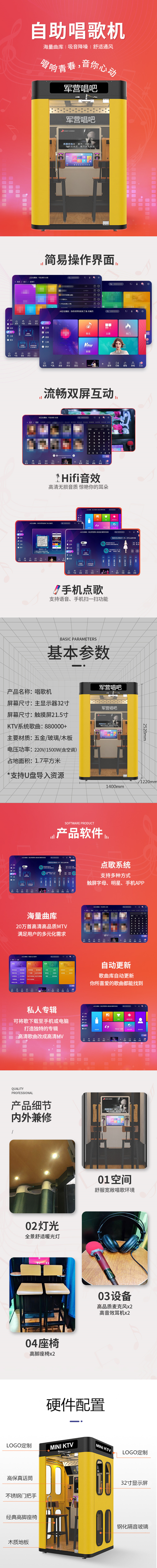 產(chǎn)品特點(diǎn):軍營唱吧迷你版長寬高尺寸:1400mm*1220mm*2520mm,它的外觀設(shè)計(jì)非常有特色,顏色主打黃色,亮眼且時(shí)尚,兩側(cè)邊分別有4個(gè)橢圓形,橢圓形里面裝了隔音玻璃,內(nèi)飾更是溫馨豪華,帶有通風(fēng)系統(tǒng)和燈光系統(tǒng),特加了空調(diào)系統(tǒng),雙耳機(jī),雙話筒,雙座椅,適用于:圖書館、黨建室、軍營、單位、企業(yè)公司等場所。
