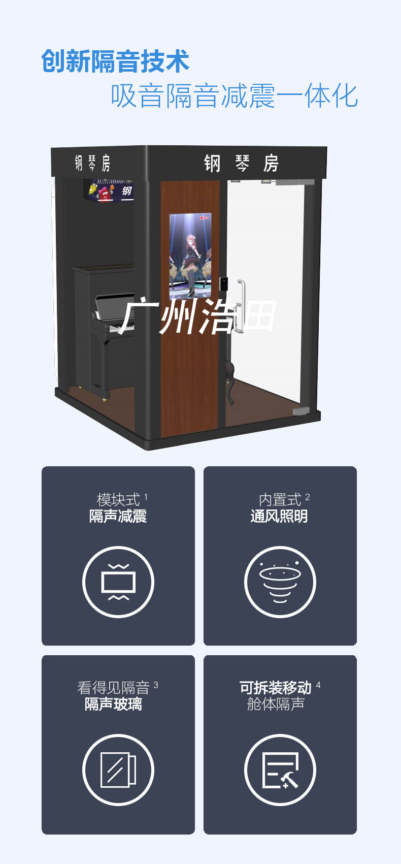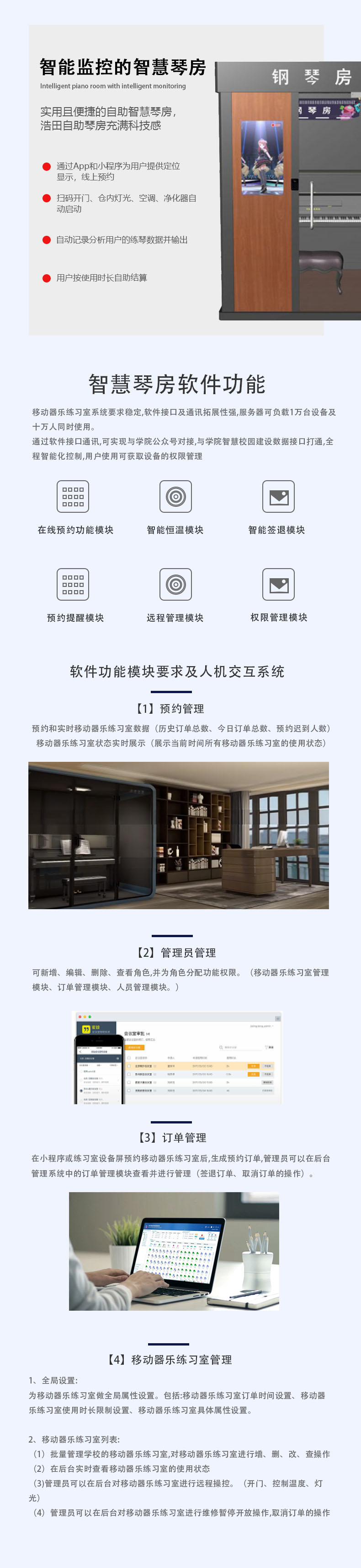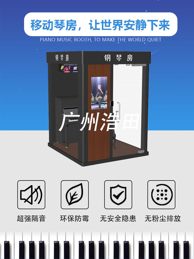 產品特點:可以通過App和小程序為用戶提供定位顯示,線上預約、掃碼開門、倉內燈光、空調、凈化器自動啟動,自動記錄分析用戶的練琴數據并輸出建議指導,用戶按使用時長自助結算,是一款很實用且便捷的自助智慧琴房,浩田自助琴房令充滿科技感.