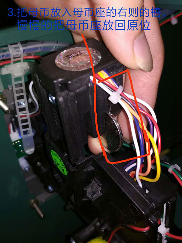 2.準備好母幣(硬幣、游戲幣)放入母幣座的右側槽中,并慢慢把母幣座放回原處。