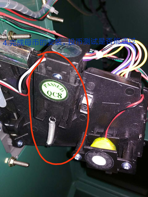 1.先把投幣器彈簧取出,投幣座往上拉