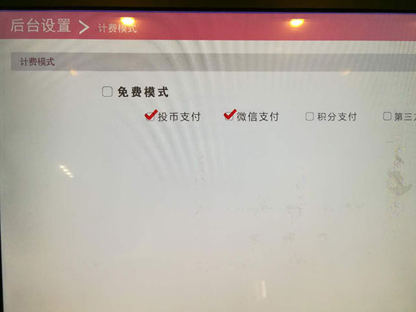 1.在后臺設置收費模式,勾選“投幣支付”