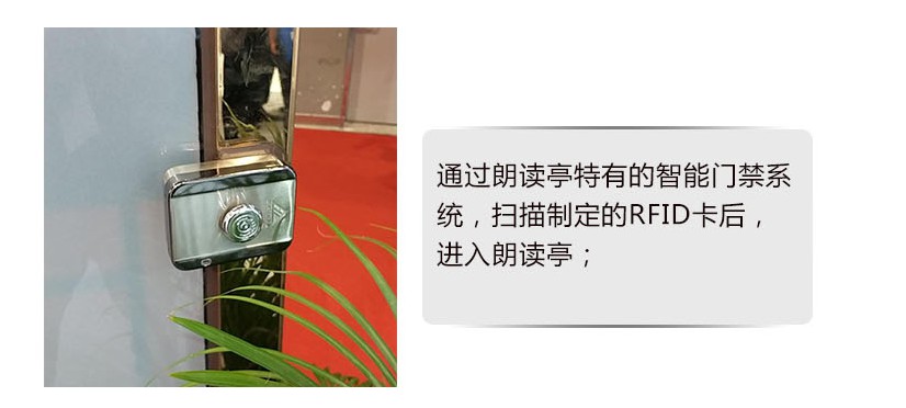 1、通過朗讀亭特有的智能門禁系統,掃描制定的RFID卡后,進入朗讀亭;