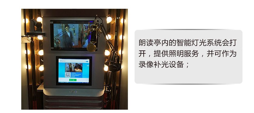 2、朗讀者進入朗讀亭后,朗讀亭內的智能燈光系統會打開,提供照明服務,并可作為錄像補光設備;