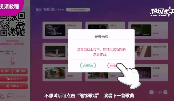 4錄音只有一次機會,當你演唱完后,歌曲自動上傳服務器上,當中,你可以試聽錄音效果,也可以點擊繼續唱歌。