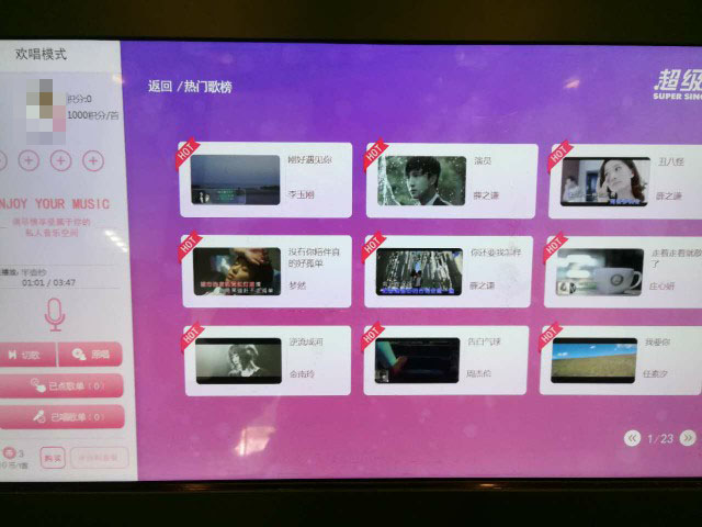 下方有四個不同顏色的虛擬按鈕,分別代表不同的點唱功能,第一是“熱門點歌”包含最近熱門點唱歌曲,第二是“歌星點歌”包含大陸,港臺的男女歌手明星,可編輯查找。