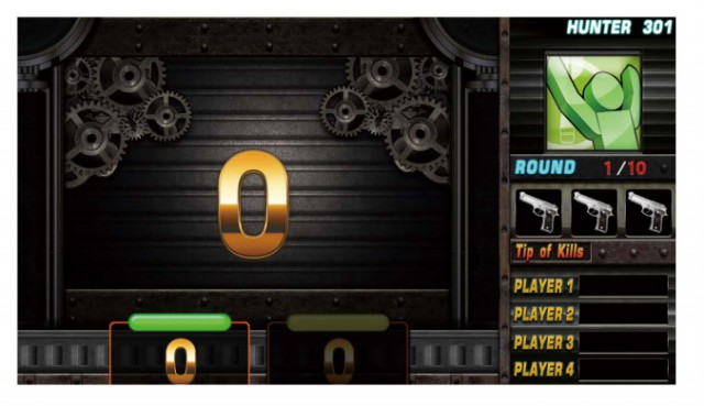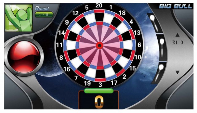 此游戲可投擲飛鏢以槍的圖案顯示, 屏幕中間出現(xiàn)彩色豎條表示玩家當(dāng)前分?jǐn)?shù)。