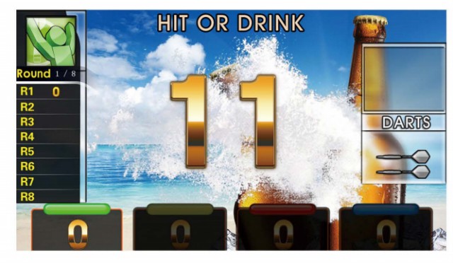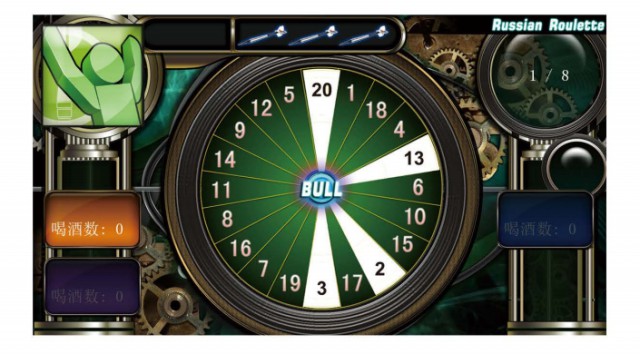 每輪以屏幕上顯示的分區(qū)和紅心為目標(biāo), 投中即可獲得相應(yīng)分?jǐn)?shù), 若3鏢內(nèi)未能投中則得分減半, 并罰酒一杯, 最后得分最高者獲勝。