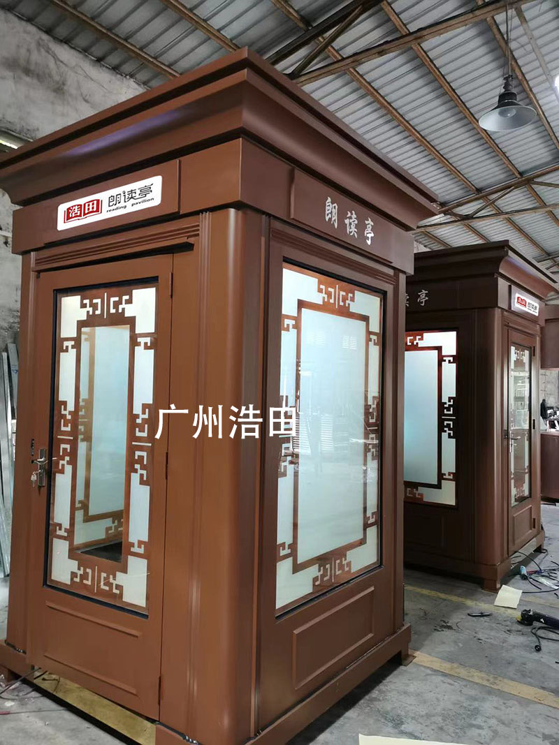 朗讀亭尺寸定制:1.7*1.7*3.0米或者1.5*1.5*3.0米(可以根據您要求來定制朗讀亭)朗讀亭亭身及基座均采用汽車鈑金機加工成型,表面噴戶外氟碳漆處理,有部分客人問道這個朗讀亭封閉式的不悶嗎?里面這么小,怎么處理呢?其實朗讀亭內部是可以裝空調的,還能裝換氣扇,只是要把空調做成隱藏起來的,整個亭身的裝飾采用激光切割而成,內墻及吊頂均采用不銹鋼制作而成,內部采用雙層防火保溫板,具有隔熱、保溫的功能,走暗敷線路,內飾搭配暖光燈效果,整個亭子是非常溫馨的。